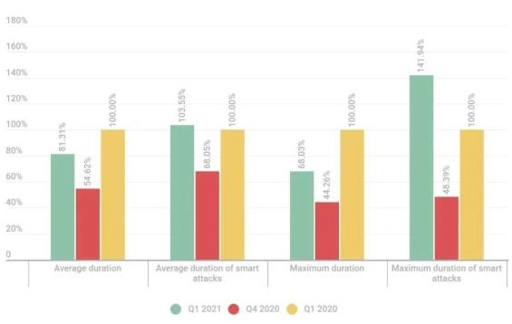 DDoS 攻击呈上升趋势,2021 年第二季度比 2021 年第一季度增加了 19%。